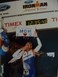 Ironman Arizona 2011, my mother was battling terminal breast cancer. Knowing she was watching me finish via the internet I made this sign and blew a kiss into the camera. She was my biggest fan, miss her dearly.